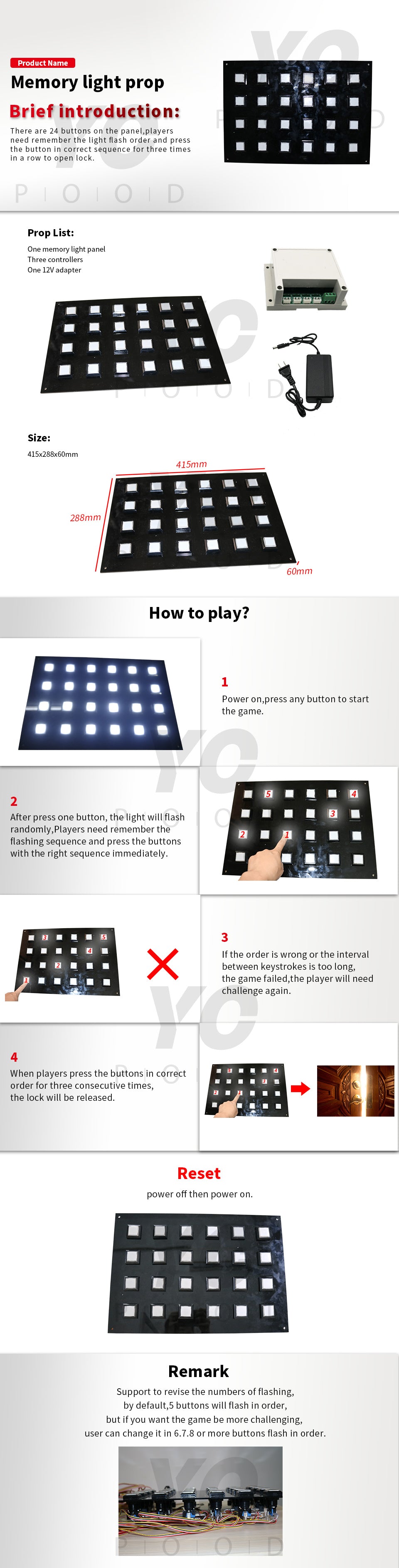 Brief Introduction:There are 24 buttons on the panel,players need remember the light flash order and press the button in correct sequence for three times in a row to open lock.